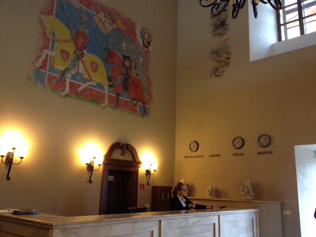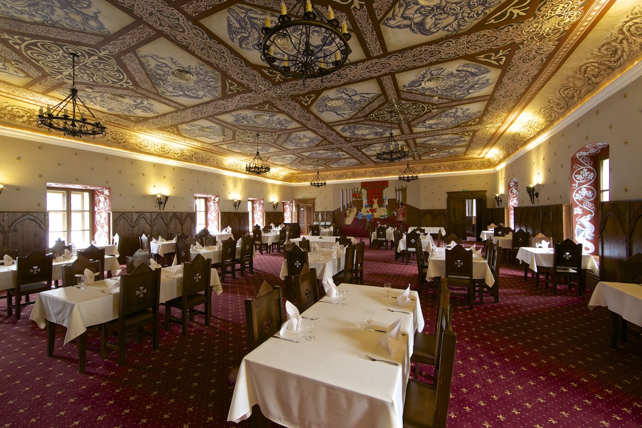 Ďalej poukázal na to, že honosná reštaurácia AnjouCourt je nazvaná podľa kráľovského rodu Anjou, ktorého prítomnosť vyjadrujú rodové ľalie a bohato zdobený, ručne maľovaný strop. Dominantou reštaurácie je grandiózny krb, nad ktorým sa vyníma reliéf uhorského a českého kráľa a rímsko-nemeckého cisára Žigmunda pri audiencii poslov Rádu nemeckých rytierov.Ručne maľovaná freska na protiľahlej stene symbolizuje vstup do ďalšej miestnosti i času a znázorňuje stolovanie v stredoveku. Jedlá sú podávané formou polpenzie a od decembra postupne aj á la carte.