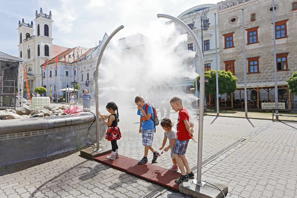 Teplota vzduchu sa zvyšuje každou hodinou, preto malým i veľkým dobre padne jemná hmlová sprcha rozprašovaná z kovového vodného oblúka. Skvelý nápad.