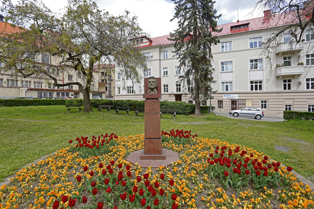 Oproti v parčíku pred Štátnou operou v krásnom kvetinovom oblúku stojí busta Ladislava Novomeského. Tá si v minulosti užila svoje, ale dnes sa môže spokojne pozerať na kvety okolo seba