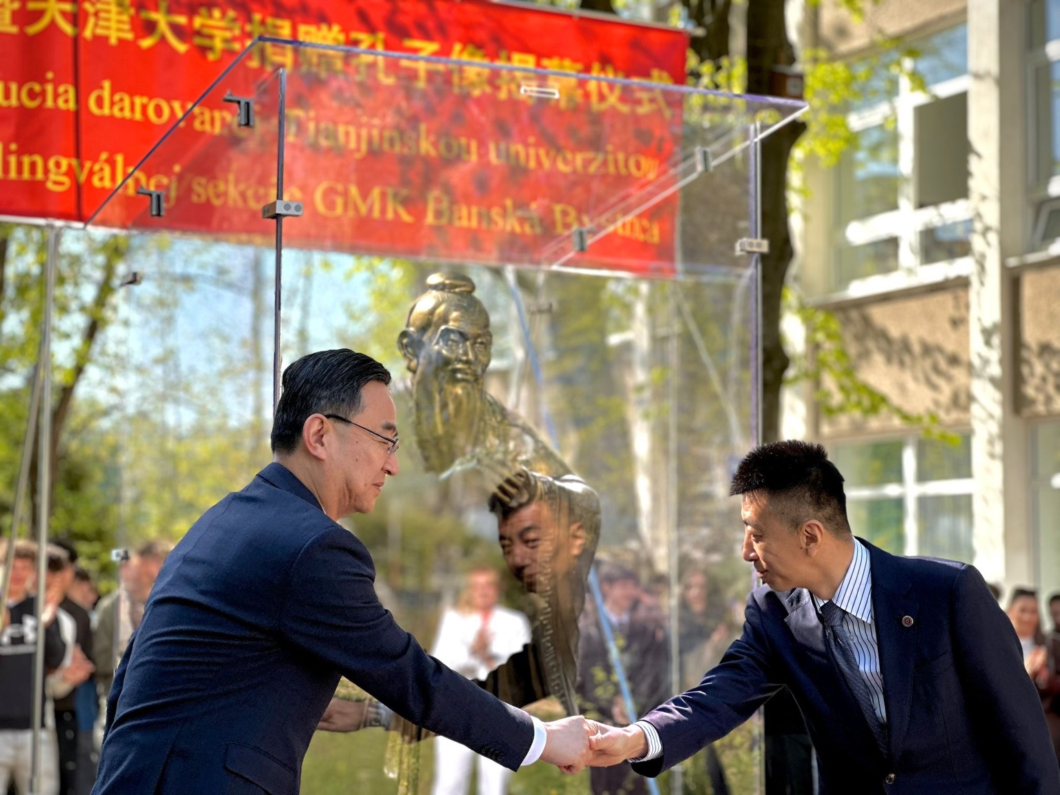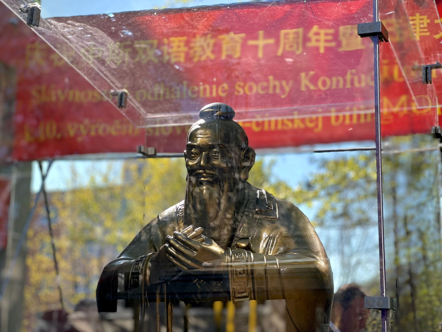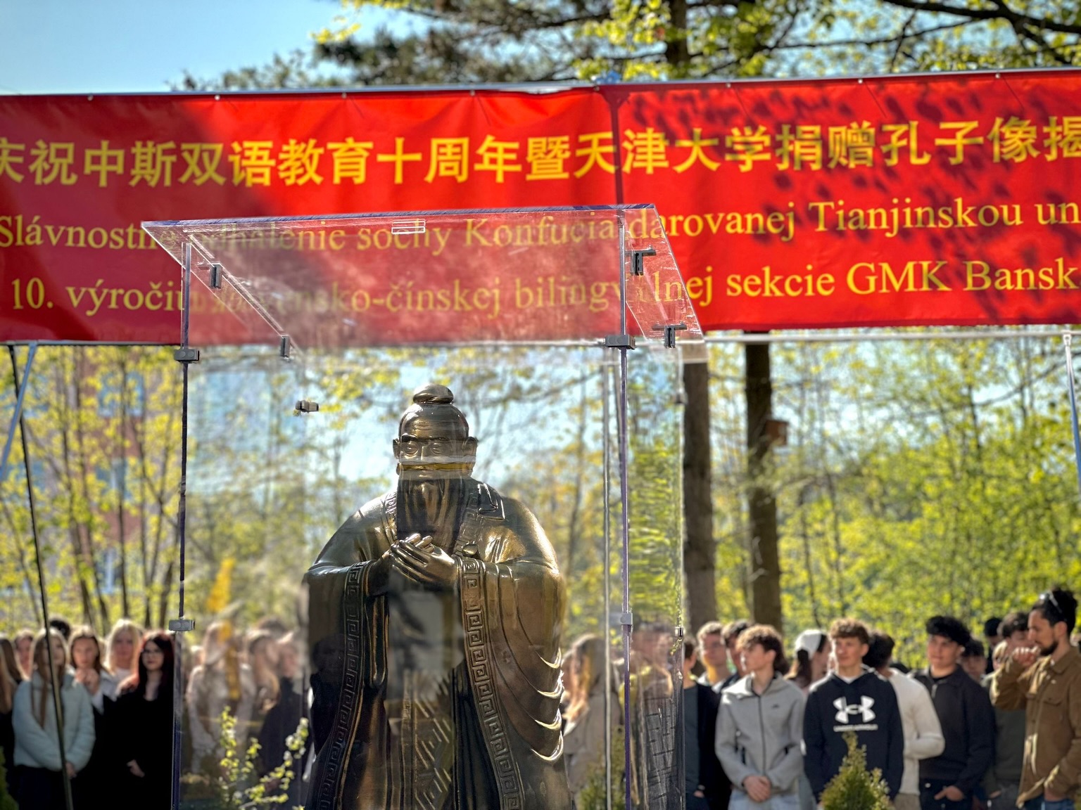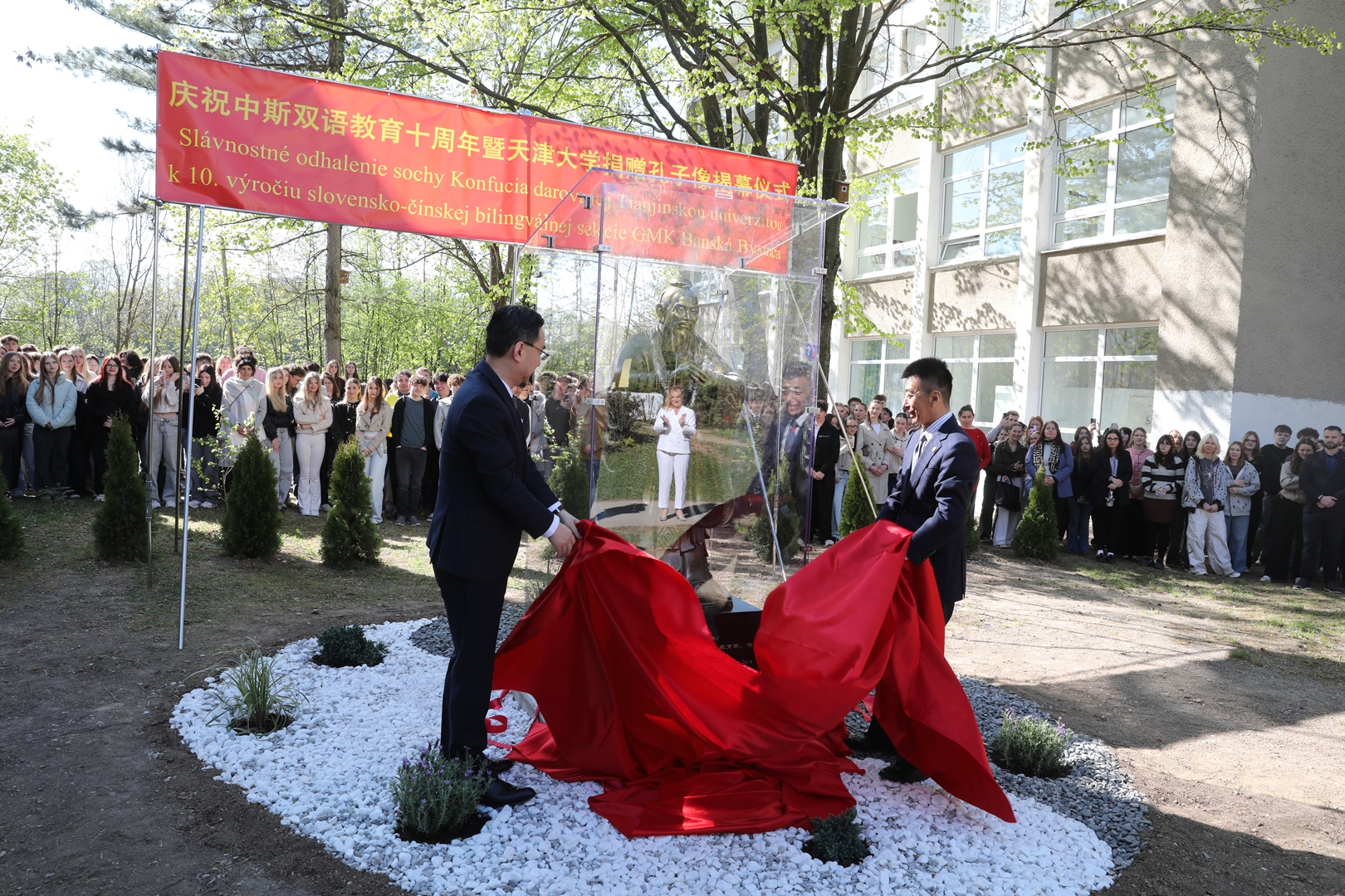 FOTO: Slávnostné odhalenie sochy Konfucia pri Gymnáziu Mikuláša Kováča v Banskej Bystrici