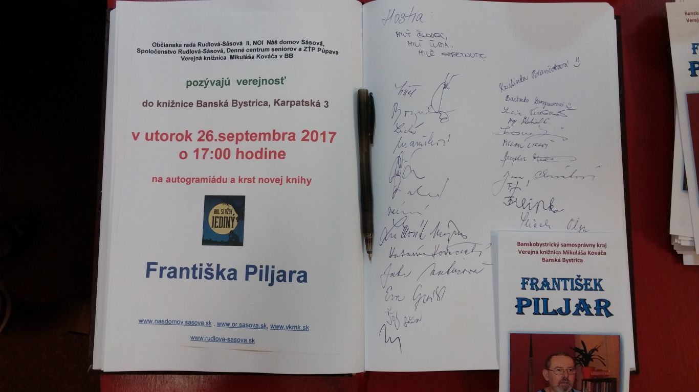 V utorok 26. septembra sa v priestoroch Verejnej knižnice Mikuláša Kováča na Karpatskej 3, uskutočnila autogramiáda a krst novej knihy „Bol si vždy jediný“ spisovateľa Františka Piljara. Podujatie sa uskutočnilo v rámci Utorkov v knižnici, na ktorých Občianska rada predstavuje osobnosti žijúce medzi nami a pri príležitosti krásneho jubilea 65. narodenín, ktoré autor oslávi už túto sobotu.