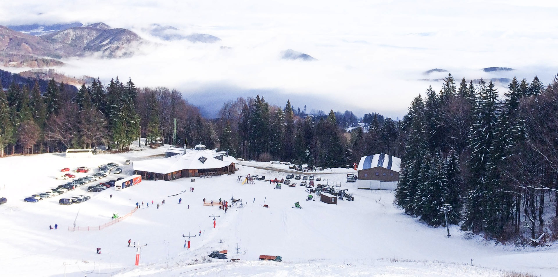 Pri zavretom penzióne, na parkovisku ešte viac áut. A ľudia roztrúsení po okolí. No poďme ešte ďalej, na lyžiarsky svah. Pri zavretej rozľahlej kolibe.