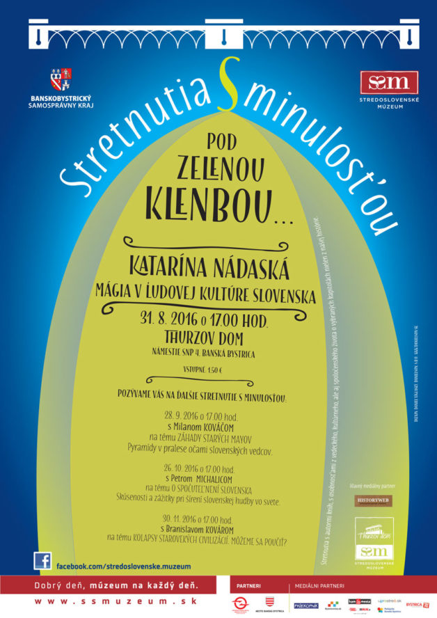 Stredoslovenské múzeum v mesiaci august pozýva všetkých záujemcov o históriu v spojení s mágiou na Stretnutia s minulosťou pod Zelenou klenbou. Už túto stredu 31. augusta 2016 o 17:00 hod. zasvätí návštevníkov Thurzovho domu do mágie v ľudovej kultúre Slovenska – Katarína Nádaská.