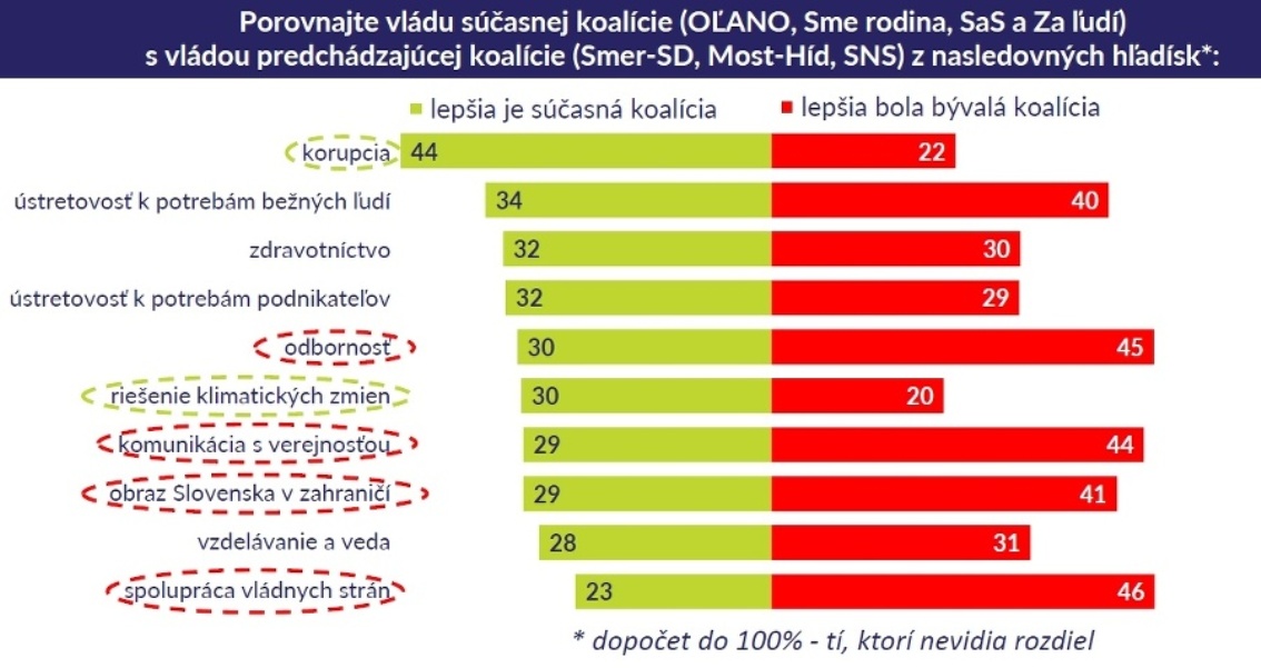 „Súčasná vládna koalícia si podľa občanov oproti minulej počína omnoho lepšie pokiaľ ide o korupciu a klimatickú zmenu. O čosi viac ľudí jej dáva kredit aj v otázke podnikateľského prostredia a zdravotníctva. Naproti tomu bývalú koalíciu hodnotia ľudia omnoho lepšie z hľadiska spolupráce vládnych strán, komunikácie s verejnosťou, ale aj odbornosti, obrazu Slovenska v zahraničí a porozumenia potrebám ľudí,“