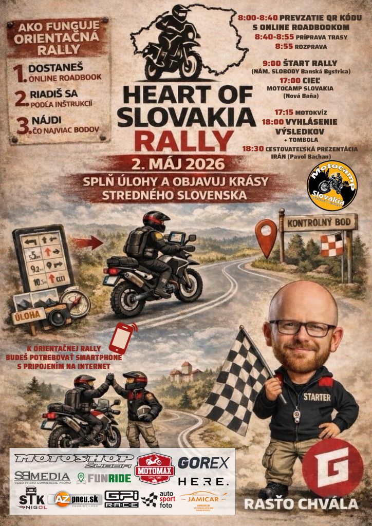 Motorkári z celého Slovenska sa 2. mája 2026 stretnú na jedinečnom podujatí HEART OF SLOVAKIA RALLY 2026, ktoré oficiálne otvorí motosezónu v srdci Slovenska. Podujatie prináša nový formát orientačnej moto-rally, kde nejde o rýchlosť, ale o kombináciu jazdeckých schopností, plánovania a orientácie.