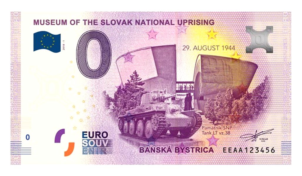 „Na prvej 0 euro souvenir bankovke Slovenska, ktorá je vyrobená v limitovanom náklade 5000 ks, je zobrazený práve Pamätník SNP, v popredí ktorého je situovaný tank česko-slovenskej produkcie s označením LT vz. 38, ktorý úspešne zasahoval do bojov počas SNP,“