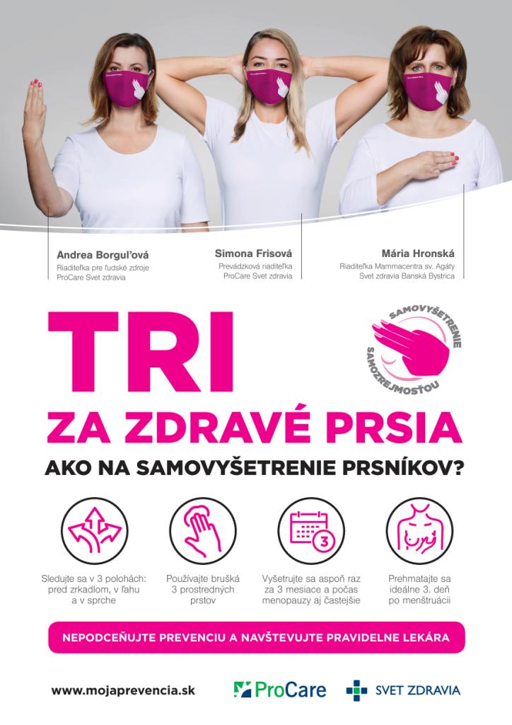 Do kampane Tri za zdravé prsia sa zapája 17 nemocníc Svet zdravia a 12 polikliník ProCare aj dve administratívne centrály v Bratislave a v Košiciach. Stovky zamestnancov sa budú počas celého dňa fotiť s ružovým oblečením či rúškami a svoje fotky budú zdieľať aj na sociálne siete s popisom #trizazdraveprsia. Kampaň podporila aj olympijská víťazka Nasťa Kuzminová.