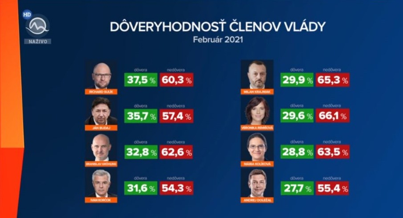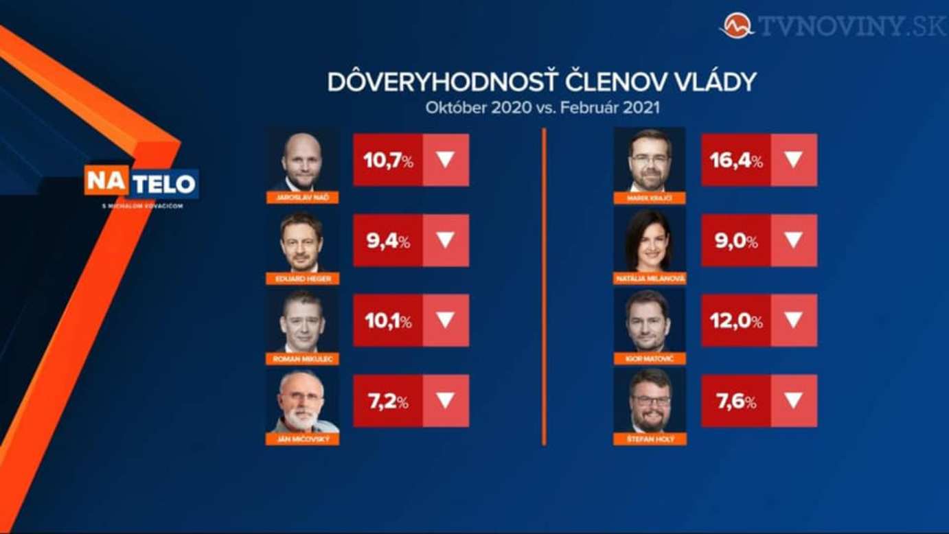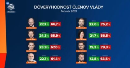 Hoci najnovší prieskum (ne)dôveryhodnosti členov Matovičovej vlády, ktorý vykonala agentúra Focus, pre televíziu Markíza od 17. do 24. februára na vzorke 1 018 respondentov, ešte nezachytil aktuálnu koaličnú krízu, jeho výsledky sú pre vládnu koalíciu doslova katastrofálne.