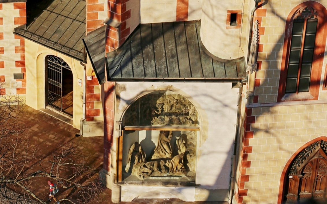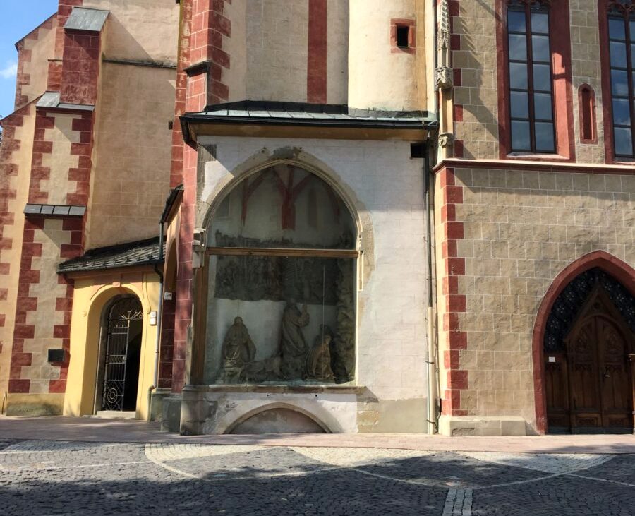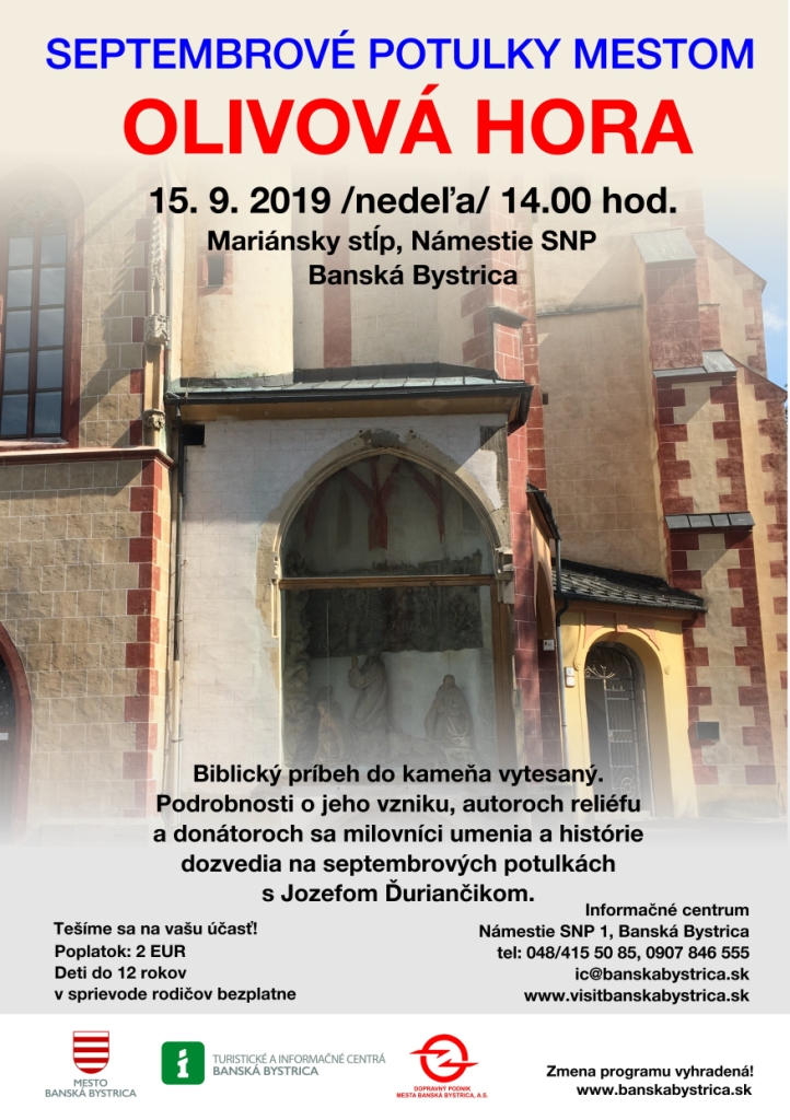 Nedeľné Potulky mestom Banská Bystrica 15. septembra 2019 so zrazom o 14:00 hod. pri Mariánskom stĺpe na Námestí SNP budú venované reliéfnemu súsošiu Olivová hora na priečelí Kostola nanebovzatia Panny Márie.