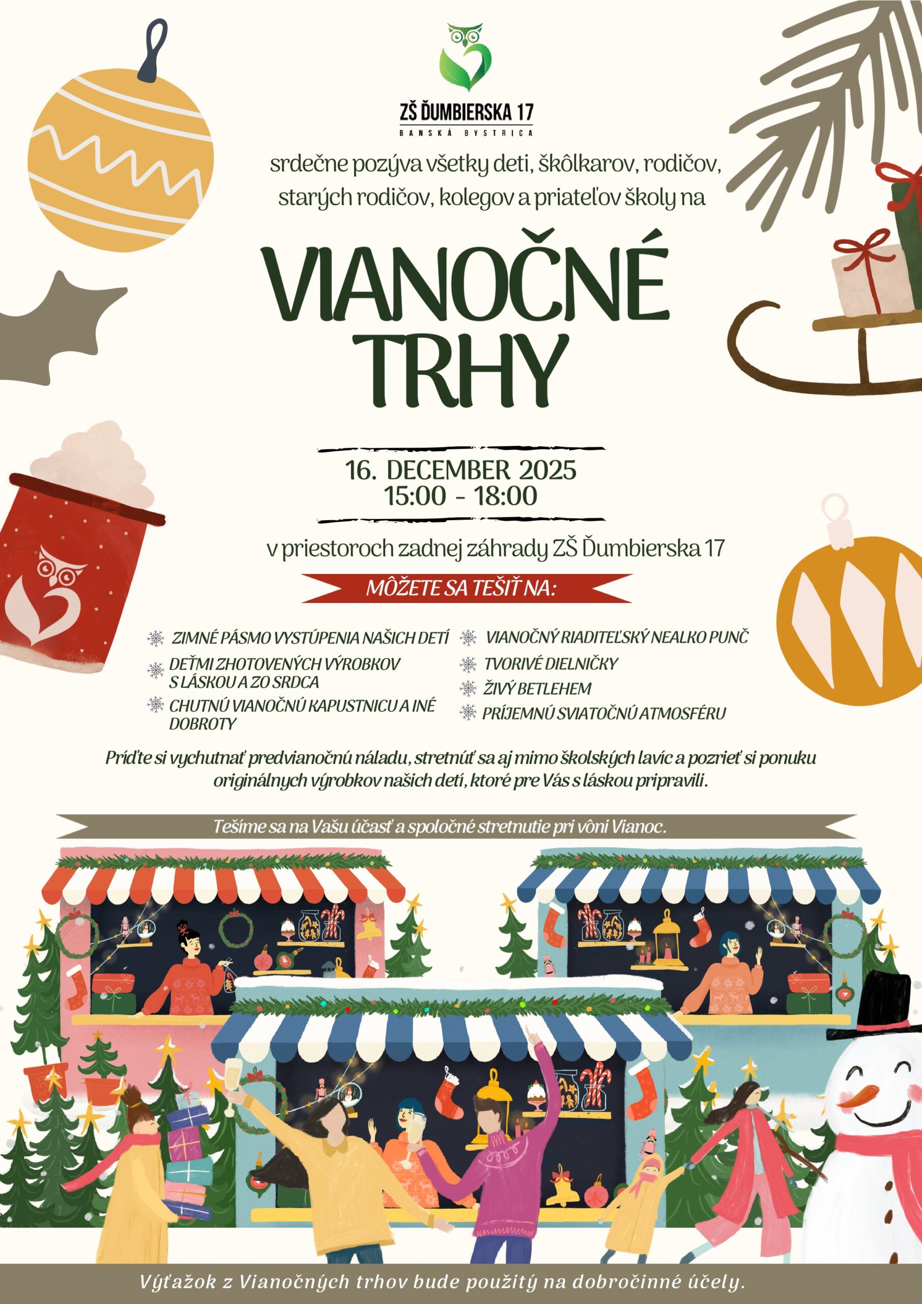 „Veríme, že Vianočné trhy v ZŠ Ďumbierska sa stanú nielen príjemným predvianočným stretnutím, ale aj dôkazom toho, že škola môže byť miestom spolupatričnosti, empatie a aktívnej pomoci druhým. Všetkých Vás srdečne pozývame nadýchať sa pravej vianočnej atmosféry, kde sa vôňa tradičnej kapustnice bude snúbiť s vôňou riaditeľského punču a slávnostnú náladu biblického príbehu umocní živý Betlehem s malými kozičkami. Ste u nás srdečne vítaní,“
