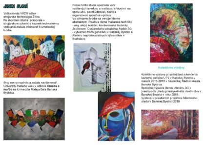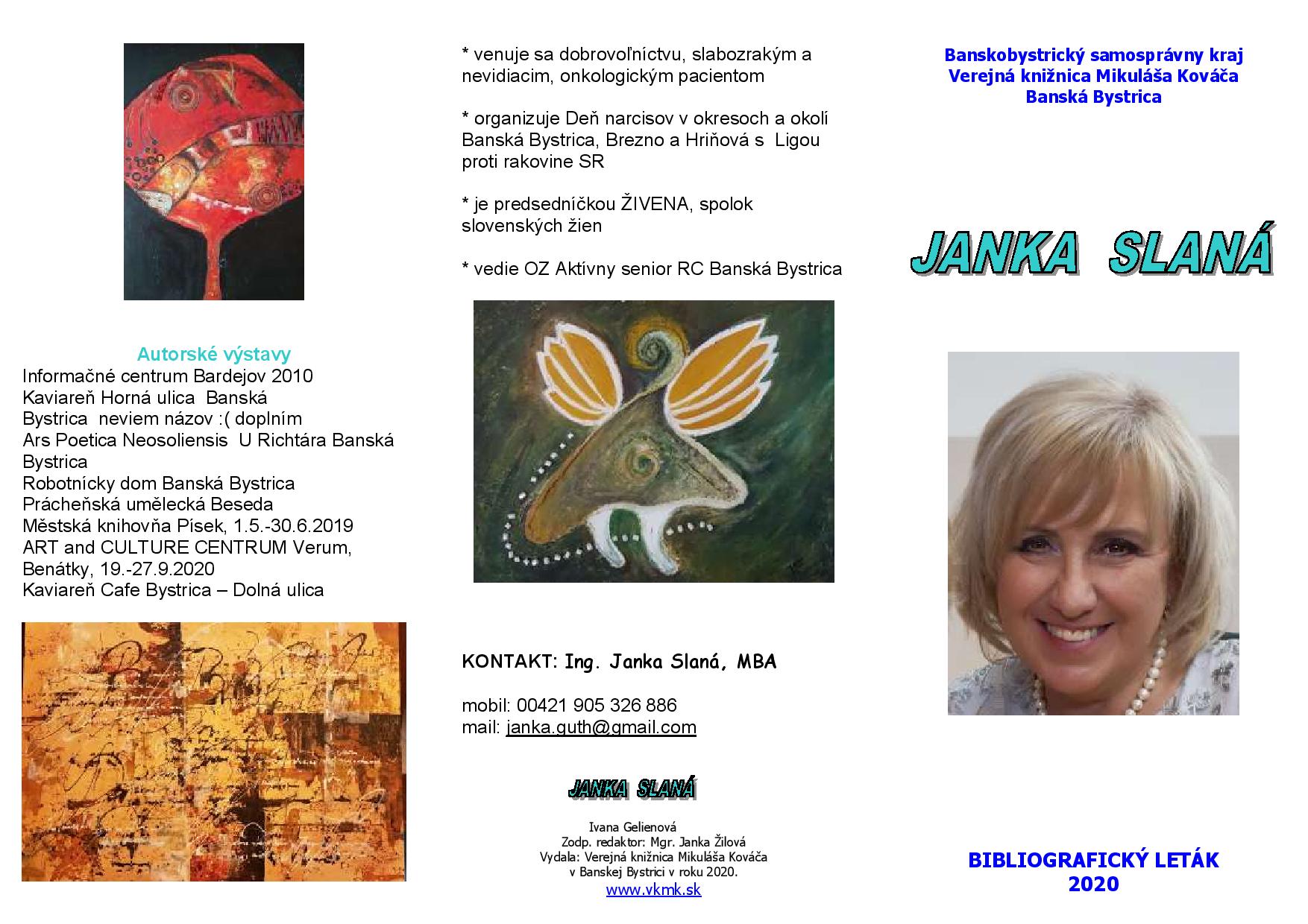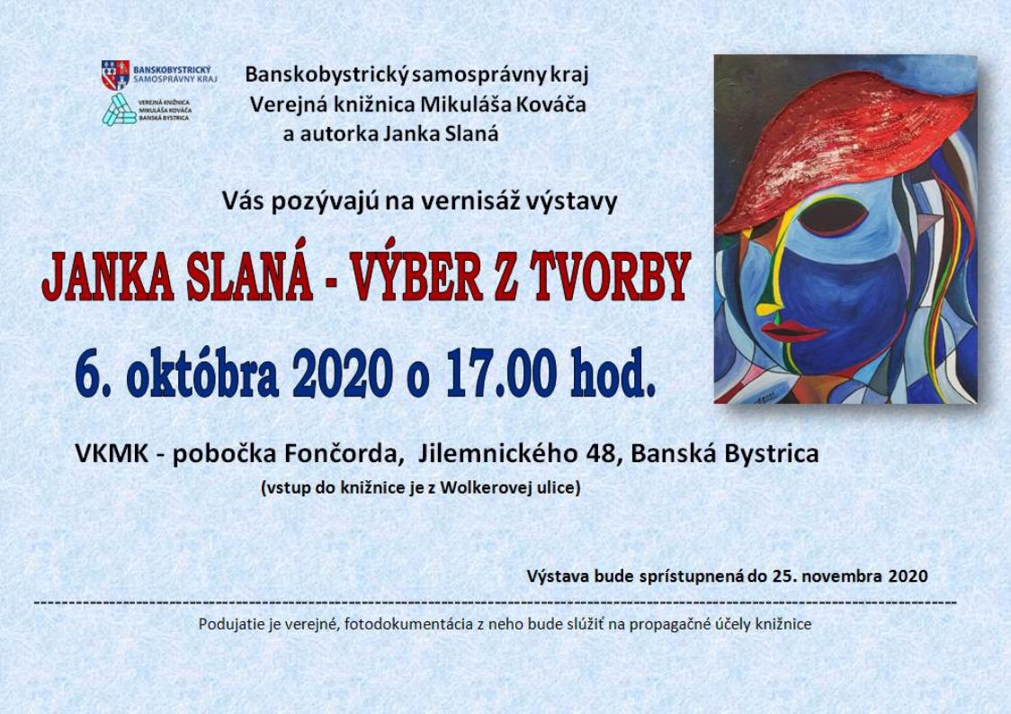 Verejná knižnica Mikuláša Kováča pripravila v spolupráci s autorkou vernisáž výstavy: JANKA SLANÁ – výber z výtvarnej tvorby. Uskutoční sa v utorok 6. októbra 2020 o 17:00 hod. v pobočke VKMK na Fončorde Jilemnického 48 (vstup do knižnice je len z Wolkerovej ulice).