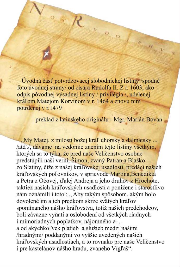 Sú tam aj ďalšie historické fakty a zaujímavosti. Strana je ilustrovaná kresbou Jána Jiskru od Mikoláša Aleša a obrázkom kráľa Mateja Korvína z dobovej kroniky ako udeľovateľ slobodníckych výsad Hrochoťanom, Slatinčanom a Očovanom vo vyfotenej listine.