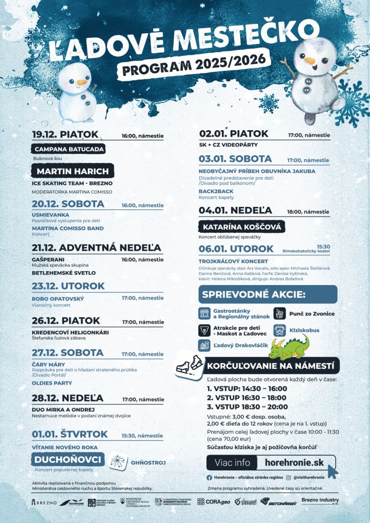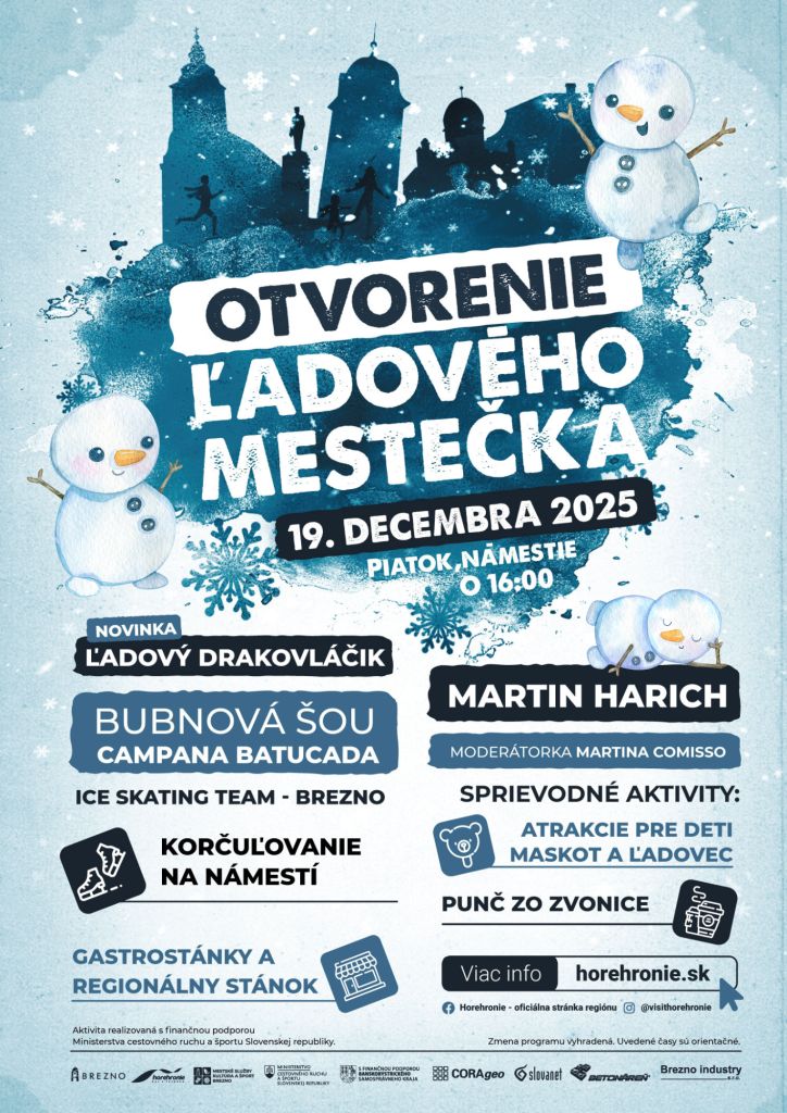 Užite si jedinečnú zimnú atmosféru na mobilnej ľadovej ploche priamo na námestí v Ľadovom mestečku v Brezne, ktorá bude prístupná od 19. decembra 2025 do 6. januára 2026.