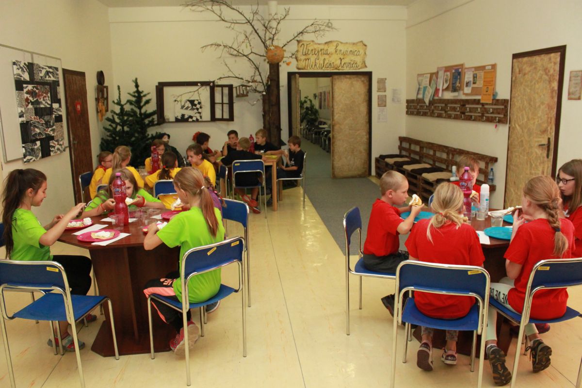 Počasie prialo indiánskym aktivitám v prírode na lúke za knižnicou, kde nechýbal indiánsky stan – Tipi. Tam sa zrodili názvy nových indiánskych kmeňov a ich bojové pokriky. Deti zaujali aj tvorivé aktivity, počas ktorých si vyrábali čelenky a indiánsky odev, opasky, maľovali na tvár. Indiánske kmene spoločnými silami postavili ohnisko z  kameňov nesúcich ich indiánske mená. Malí Indiáni so svojimi náčelníkmi si okolo ohniska aj zatancovali. Po aktivitách na lúke všetkým dobre padlo aj spoločné jedenie špekáčikov.