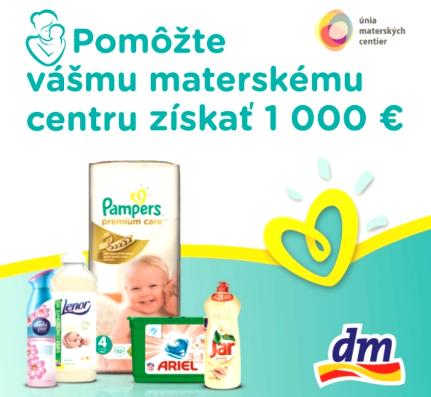Stačí, ak v predajniach dm zakúpite ľubovoľný výrobok značiek Pampers, Ariel, Lenor, Jar alebo Ambi Pur a s pokladničným blokom hlasujte za svoje materské centrum na www.pomahamemc.sk.