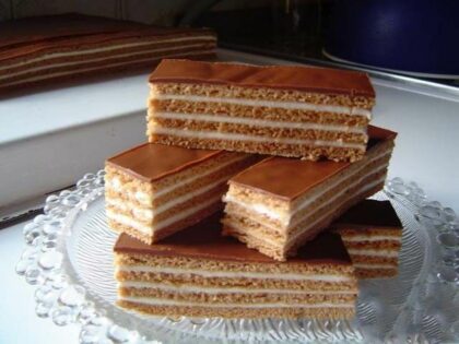 Plnenie: Naplníme pláty a necháme ich stáť najlepšie cez noc. Na vrch môžeme dať čokoládovú polevu alebo posypeme s kakaom zmiešaným s práškovým cukrom a škoricou.