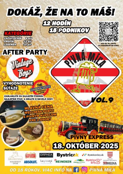 Obľúbené podujatie Pivná míľa sa opäť vracia do mesta pod Urpínom. V sobotu 18. októbra 2025 odštartuje už 9. ročník akcie, ktorá každoročne priláka stovky fanúšikov piva a dobrej nálady. Účastníci budú mať 12 hodín na to, aby navštívili 15 podnikov a ochutnali 15 pív.