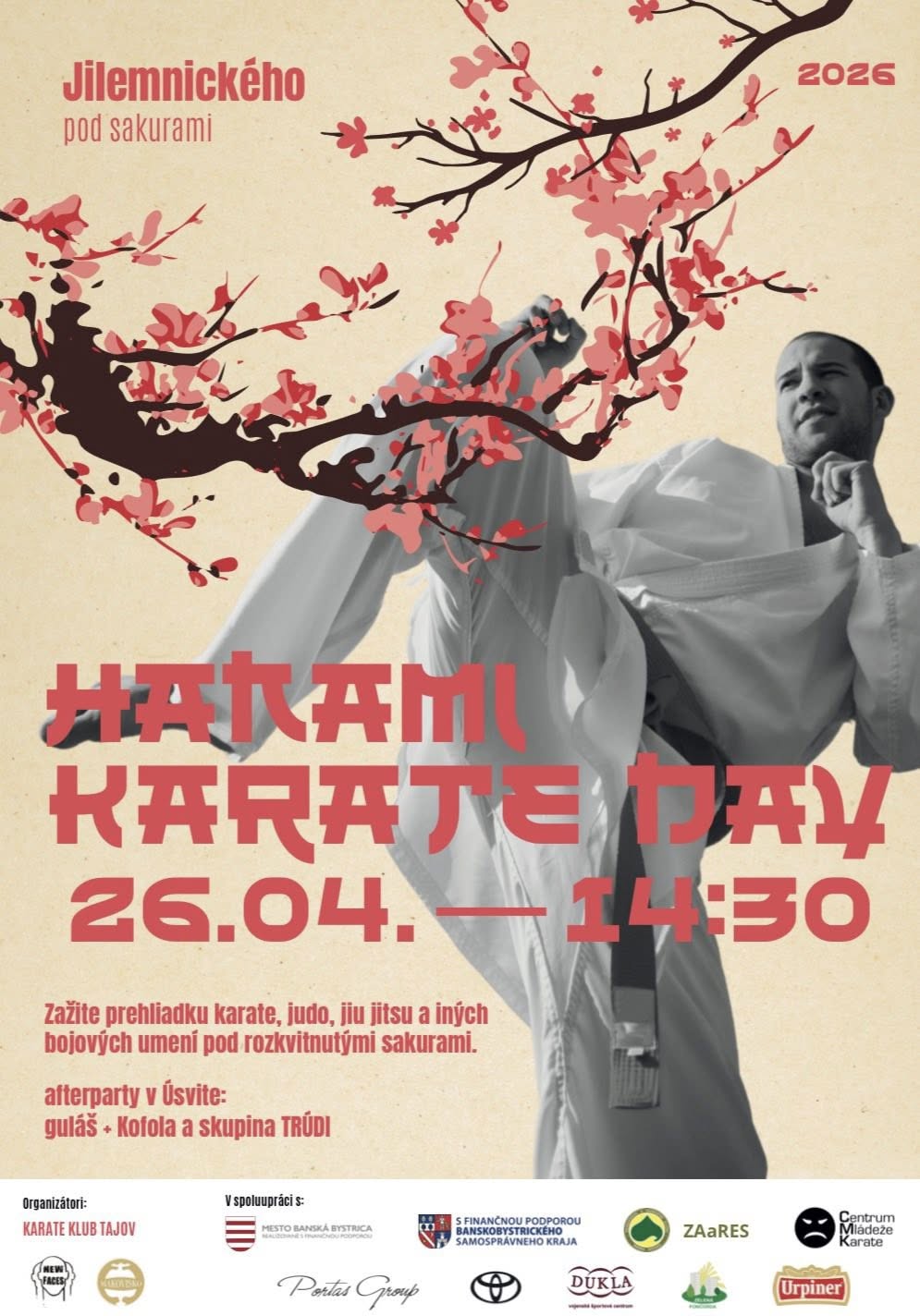 Príďte v nedeľu 26. apríla o 14:30 hod. podporiť pod ružové čerešne komunitu priaznivcov bojových športov, ktorí predvedú návštevníkom kus svojho umenia. Tešiť sa môžete aj na vystúpenie banskobystrickej kapely Trúdi, ale aj na drobné občerstvenie.