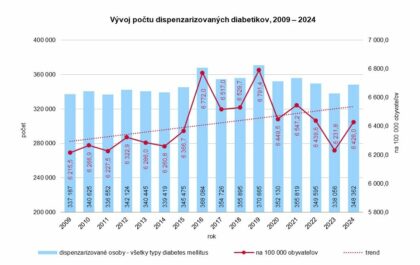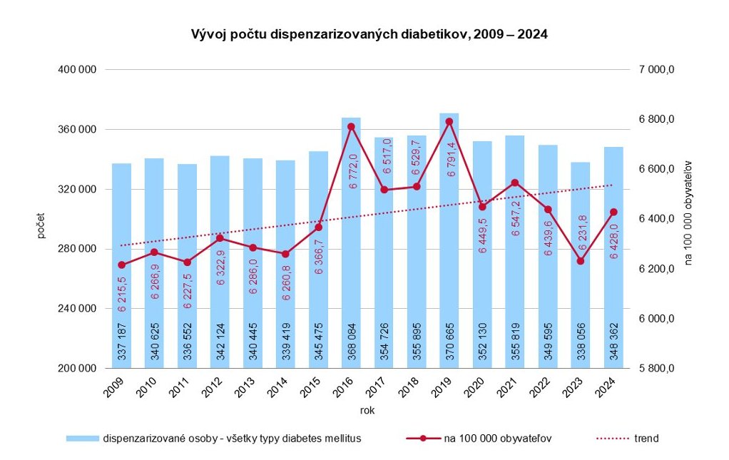V porovnaní s rokom 2023 (338 056 osôb) vzrástol počet dispenzarizovaných (dlhodobo sledovaných) pacientov v starostlivosti diabetológov o 3 %. Rovnako aj dlhodobý trend v období 2009 – 2024 poukazuje na celkový rast počtu sledovaných diabetikov s miernymi medziročnými odchýlkami.