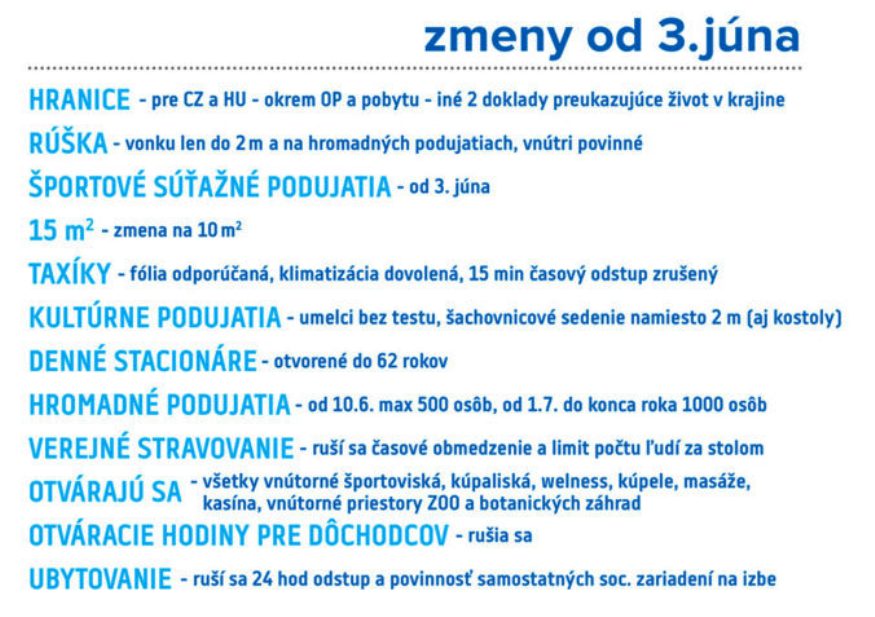 Vďaka priaznivej epidemiologickej situácii sa od stredy 3. júna uvoľňujú ďalšie opatrenia. Ruší sa napríklad vyhradený čas  pre nakupovanie dôchodcov, zmierňujú sa opatrenia týkajúce sa nosenia rúšok a otvárajú sa vnútorné športoviská.